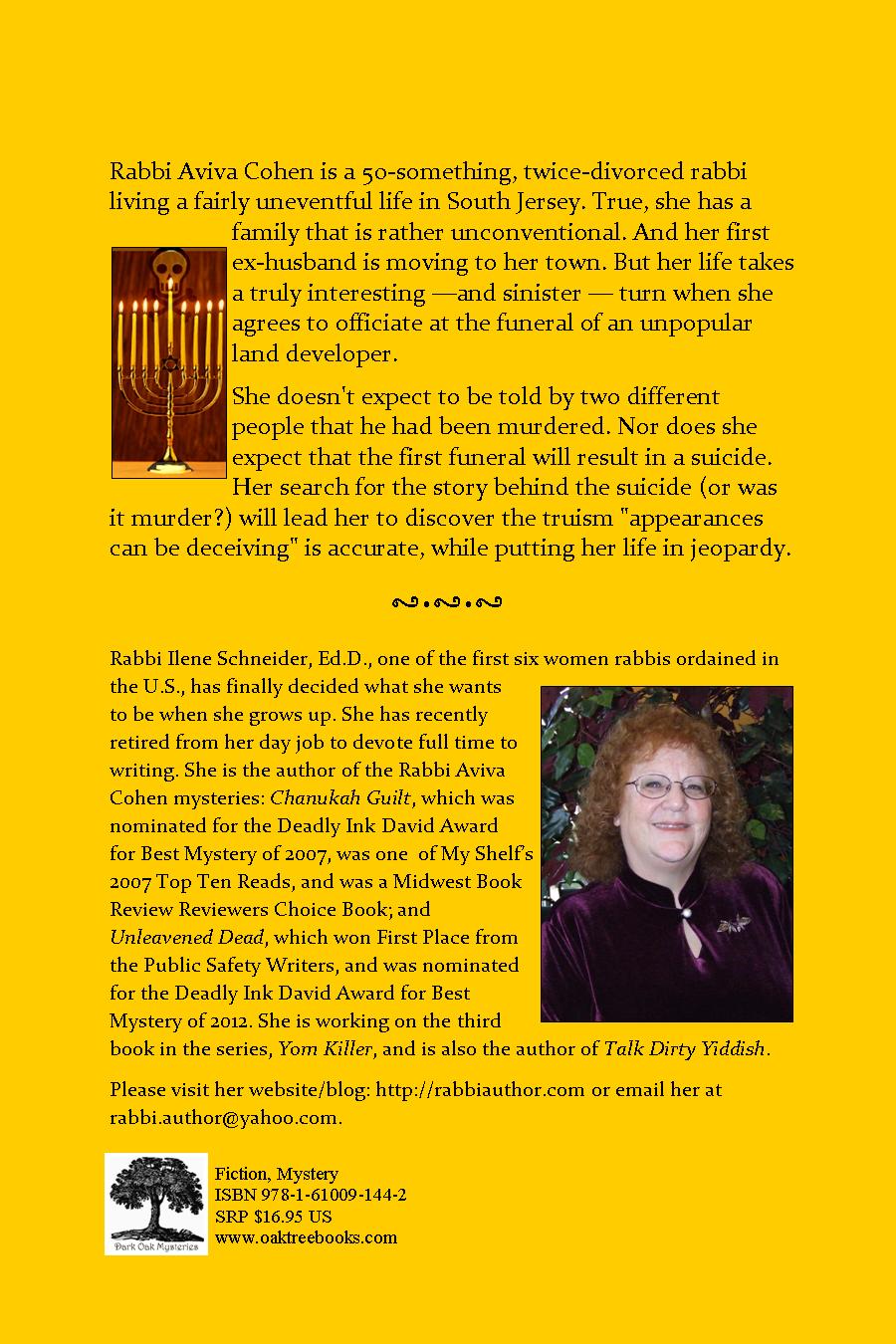 Fortunately, my current and also wonderful publisher Billie Johnson of Oak Tree Press published the second Rabbi Aviva Cohen mystery, Unleavened Dead. Reissuing Chanukah Guilt by the same publisher would mean a single source for both (and, I hope, all future) books in the series.